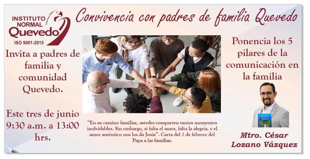 Si quieres aprender más sobre estos 5 pilares de la comunicación en la familia, te invitamos a que asistas a la Convivencia para padres de familia y comunidad Quevedo, que organiza el Instituto Normal Quevedo. Será una oportunidad para compartir experiencias, aprender y mejorar la convivencia familiar.